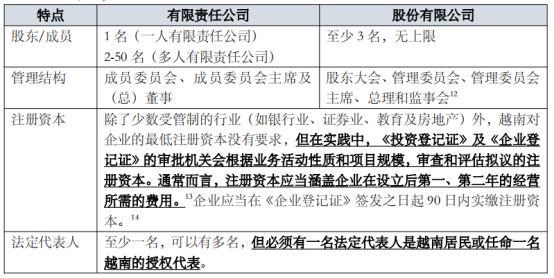 外国投资者在越南设立的企业形式通常以有限责任公司及股份有限公司为主,其特点及区别如下: